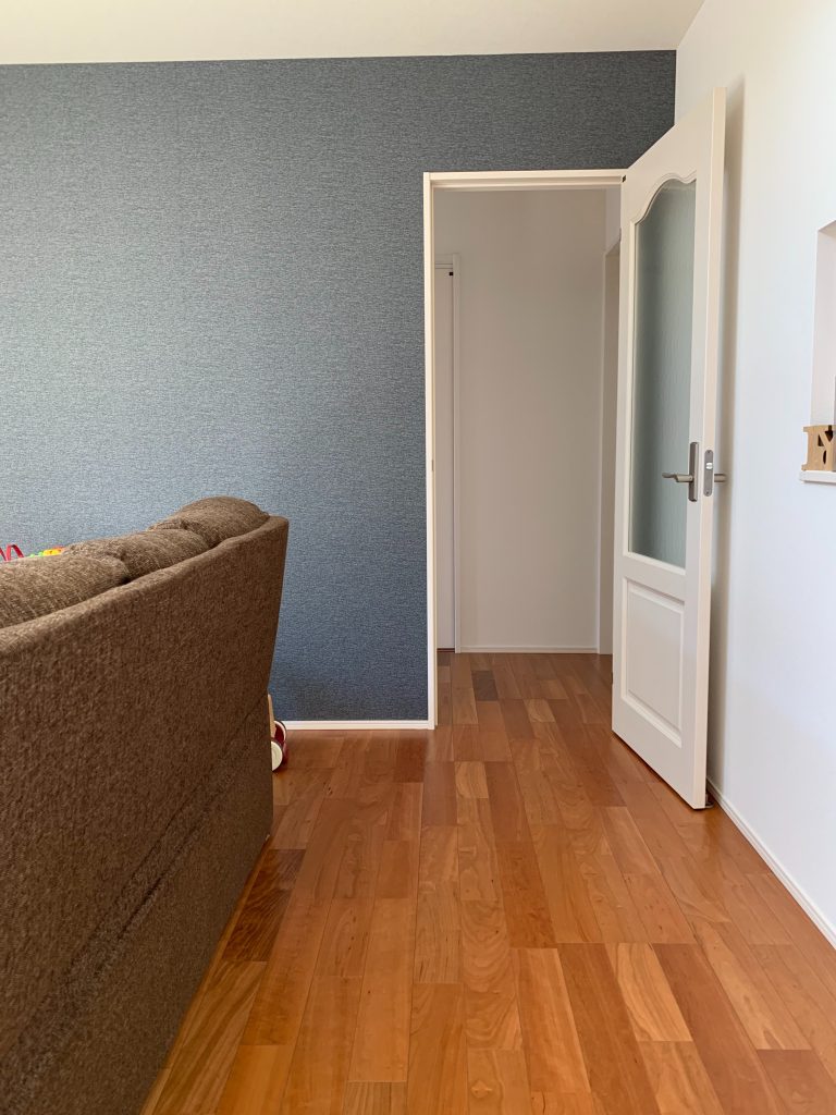 床材の色はブラックチェリーです。アクセントクロスの色とも合っていますし、今後家具の色を統一するとよりかっこいい空間になると思います。